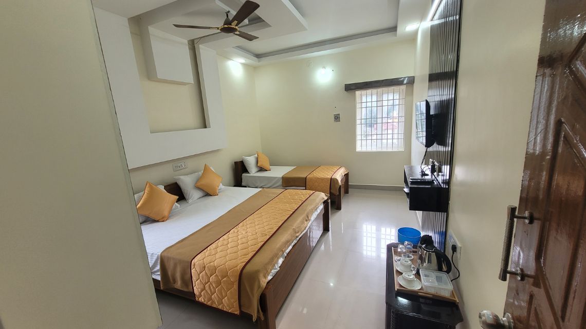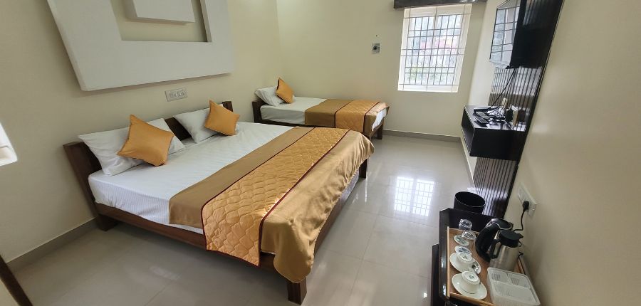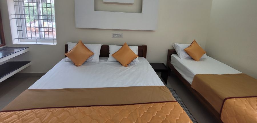 Discover the ideal getaway for families and groups in our spacious room, thoughtfully designed to provide both comfort and convenience. Featuring two king beds and two single beds, along with the flexibility of four extra mattresses on request, this room ensures everyone has a cozy place to rest. Wake up to refreshing pool views and enjoy the privacy of a modern attached bathroom equipped with essential amenities.