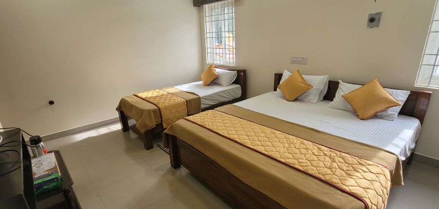 The attached bathroom is equipped with modern amenities for a refreshing experience, while the thoughtfully designed interiors combine style and functionality. Whether you’re unwinding after a day of exploration or simply enjoying a quiet retreat, every element of this room is curated to provide unmatched comfort, privacy, and a memorable stay at our resort